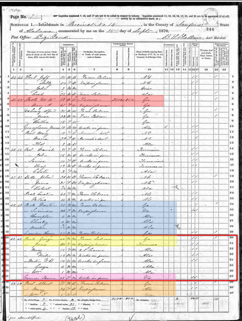 The earliest records we have of George & Jane Poole as a Family are in Milport, Sanford, Alabama in 1870 Census.
