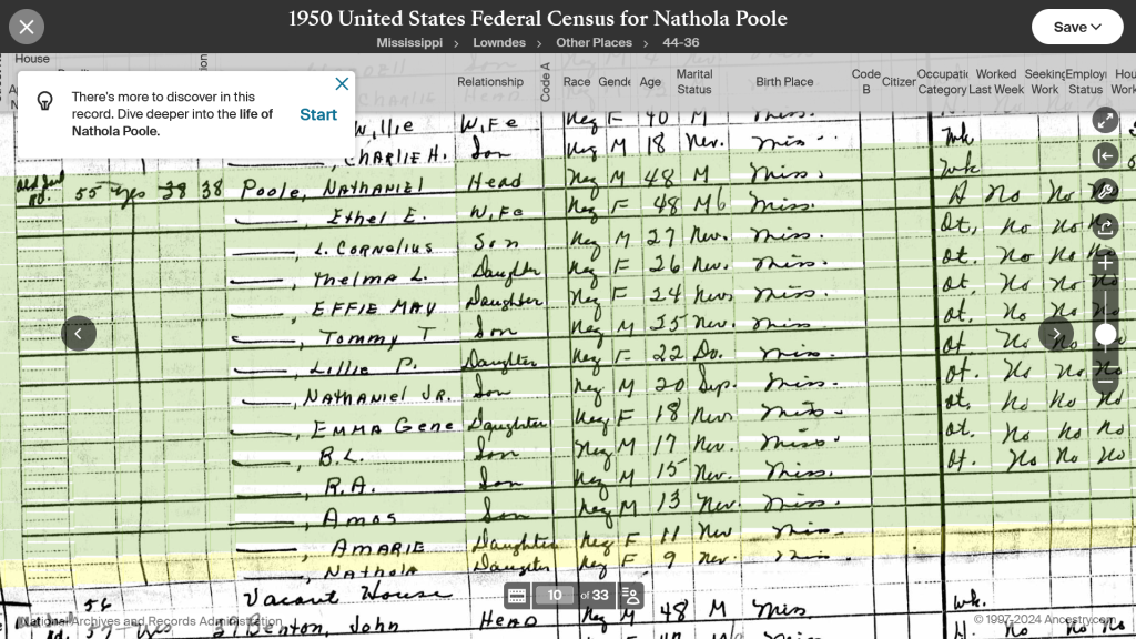 - (Highlighted in Purple) – Household of Nathaniel Poole(Not Shown in Home) Ethel Lee Benton-Poole shown as Head of the Household, w/ All the Children: L.C., Thelma, Tommie T, Effie Mae, Lillie Pearl, Nathaniel Jr., Emma Jean, Bethel, Randolph, Amos, Almarie, — Also Listed in another 1950 Census is a Mystery Child Named “Nathola” age 9… unsure if this was a mistake and is actually “Natholen aka Sunny Poole”