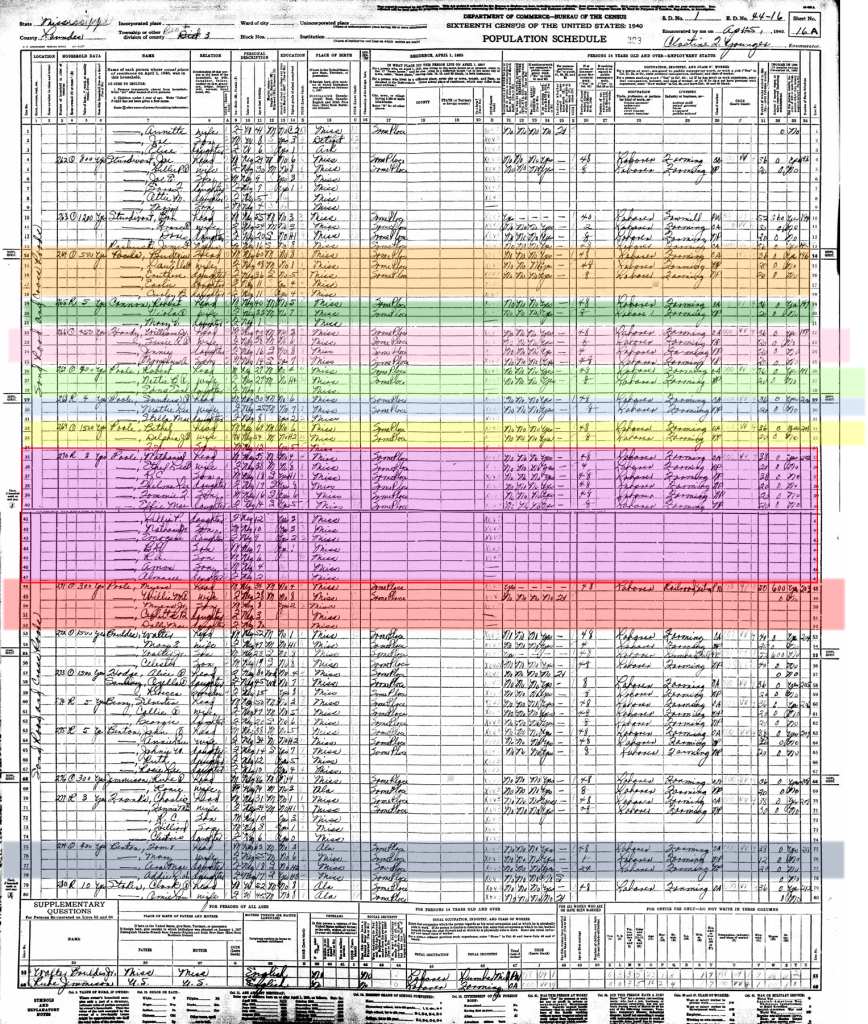 - (Highlighted in Pink) – Home of (Rev. Bethel Poole’s Son) Sanders Poole age 40 w/ Wife Mattie Lee Poole age 36 & Niece.